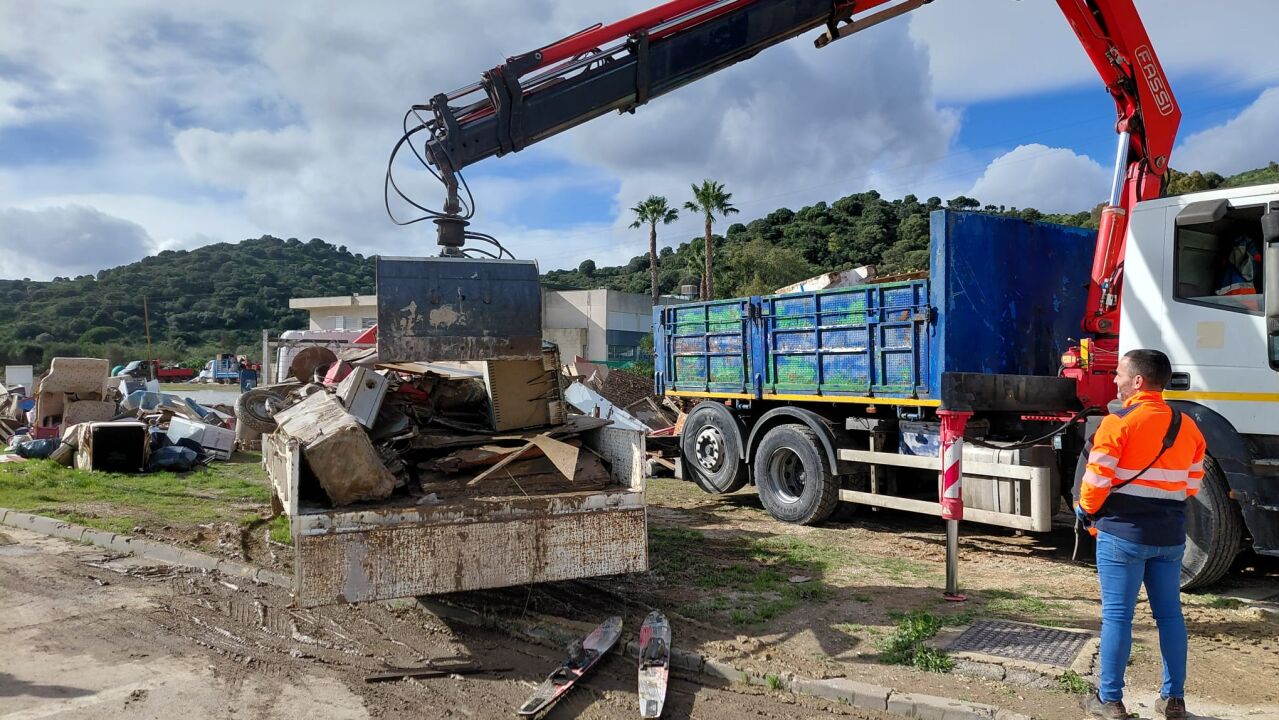 La Mancomunidad de Municipios de la Costa del Sol Occidental y Urbaser están colaborando con el Ayuntamiento de Casares en las labores de limpieza y retirada de enseres de las zonas anegadas del núcleo de Secadero.