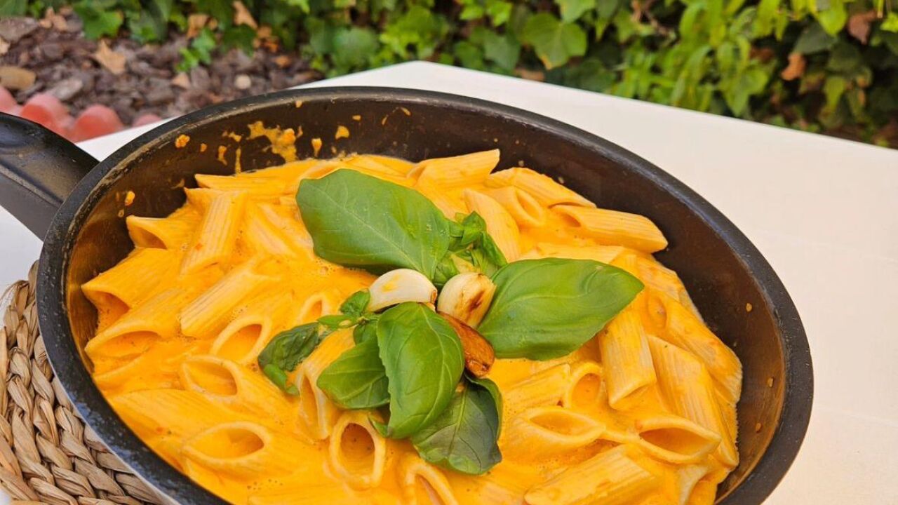 Una receta de pasta fácil y sabrosa. Para ello, comenzamos cociendo la pasta. Mientras, en una sartén añadimos los dientes de ajo y las guindillas con AOVE y cuando estén dorados, se añaden los tomates para que se frían. Cuando estén en su punto, añadimos toda esta mezcla a la batidora para hacer la salsa, añadiéndole también la burrata. Por último, se añade la salsa a los macarrones y, si la salsa se ha quedado espesa, se le puede añadir agua de la cocción. Para adornar, le podemos añadir la albahaca y queso parmesano al gusto.La receta veraniega del 12 de agosto de 2024