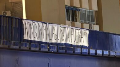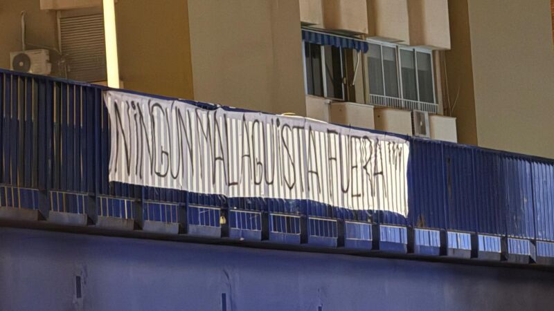 "Ningún malaguista fuera" o "Mundial sí, mentiras no" son algunas de las pancartas que se pueden ver hoy en diferentes puntos de la ciudad de Málaga. Muestras del malestar de la afición con las administraciones debido a la reducción del aforo del Ciudad de Málaga.