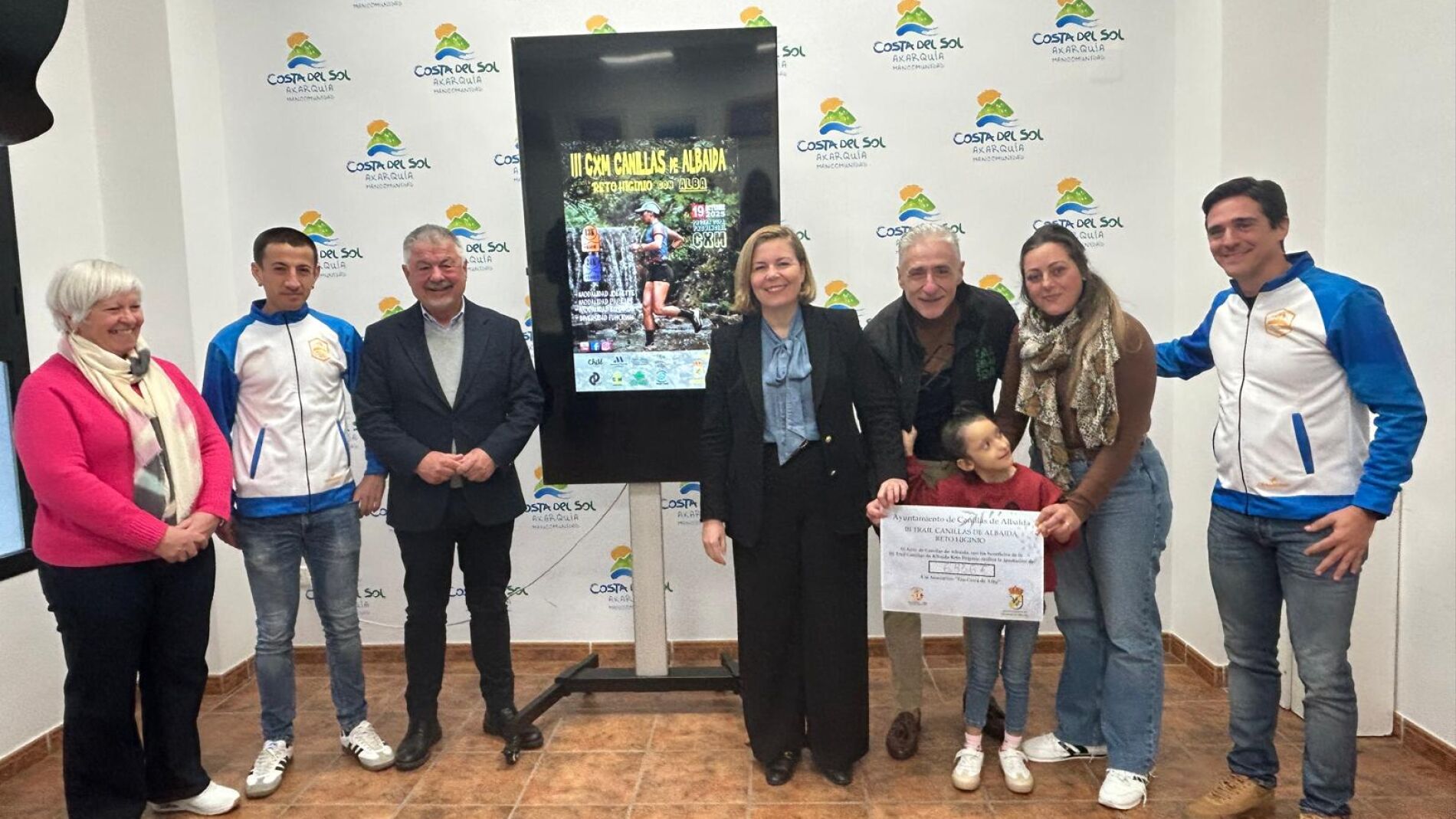 El presidente de la Mancomunidad de Municipios de la Costa del Sol Axarquía, Jorge Martín; la alcaldesa de Canillas de Albaida, Encarnación Pareja; la edil Concepción Ruiz; Carlos Marín, presidente del Club Deportivo Los Locos de la Colina junto a dos miembros del club, Vivi Ruiz y Raúl Gómez ha hecho entrega esta mañana de la recaudación del III CXM Trail Canillas de Albaida Reto Higinio con Alba, a la pequeña de cinco años y a su madre, Veronica Vila.
