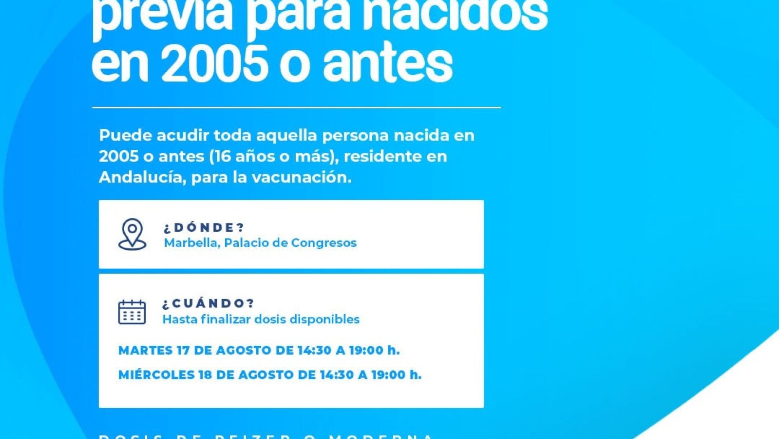 Esta semana el calendario de vacunación vuelve con jornadas sin cita para todos los mayores de 16 años, que en el caso de Marbella será en el Palacio de Congresos, hoy y mañana de 14.30 a 19.00 horas. Y en San Pedro de Alcántara, en la carpa del antiguo recinto ferial el jueves 19 de agosto de 14.30 a 19.30 horas. Entre las novedades, en la propia carpa, podrán vacunarse también sin cita los menores de entre 12 y 15 años mañana miércoles, 15:00 a 19:00 horas. Ya saben que deberán ir acompañados de un adulto. Otra gran novedad de estas jornadas es que no sólo los usuarios de los centros de salud podrán acudir, sino también los residentes andaluces que se encuentren durante esos días en el municipio.