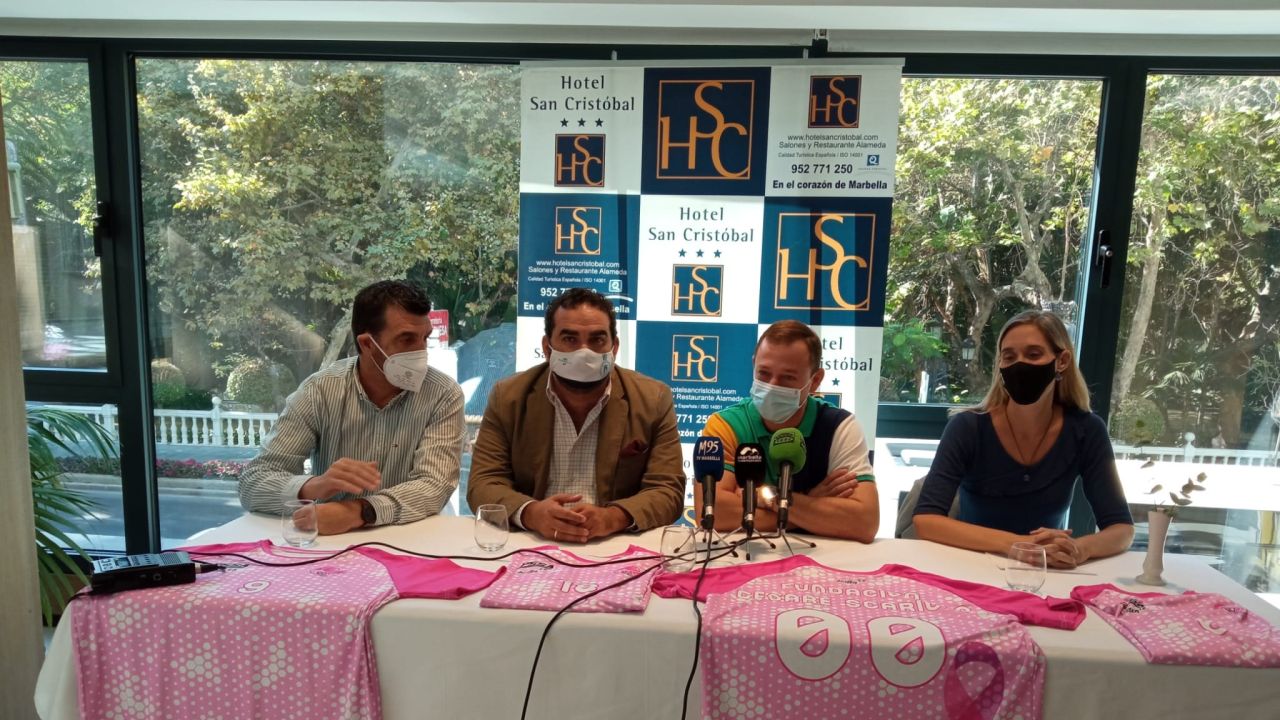 La grada azulona del Carlos Cabezas se teñirá de rosa para visibilizar a las enfermas de cáncer de mama y sus familiares. El sábado a partir de las 18.00 horas los jugadores del CB Marbella saldrán a la cancha con un cubre rosa que posteriormente venderán por 20 euros que irán íntegramente a la Fundación Cesare Scariolo. Además la asociación dejará huchas solidarias para aumentar la recaudación destinada a los trabajos con los más pequeños. La portavoz de la fundación, Pilar Ponferrada; el concejal de Deportes, Manuel Cardeña; el entrenador del club, Rafael Piña, y el director de comunicación, Álvaro del Río, junto a los jugadores Federico Giarraffa, Adri Latorre y Taylor Cameron.
