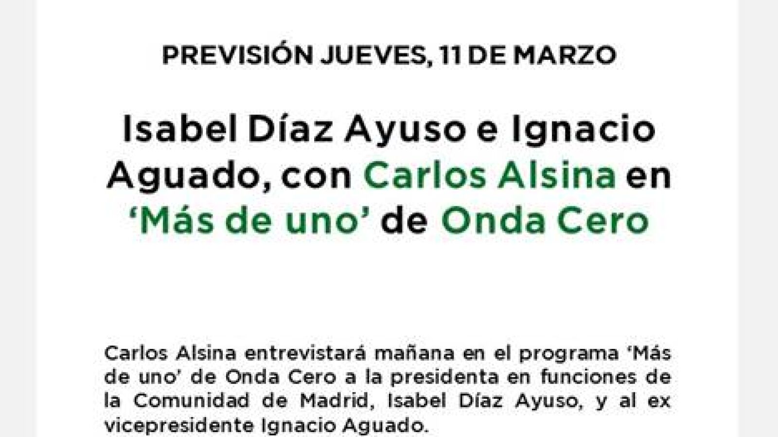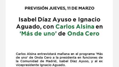 Carlos Alsina entrevista este jueves 11 de Marzo a Isabel Díaz Ayuso e Ignacio Aguado