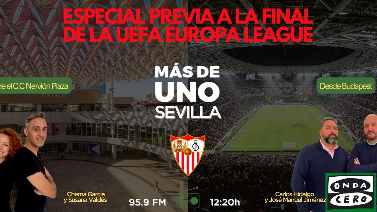 HOY, ESPECIAL MÁS DE UNO SEVILLA... En directo desde el Centro Comercial Nervión Plaza para vivir las horas previas a la final de la Uefa Europa Leaghe que enfrenta al Sevilla FC y la Roma, con conexiones en directo con nuestros compañeros de Onda Deportiva, Carlos Hidalgo y José Manuel Jiménez desde Budapest