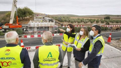 La consejera ha realizado la visita a la obra de este puente sobre la autovía A-92 con el director general de Infraestructuras, Enrique Catalina, y la delegada territorial de Fomento en la provincia de Sevilla, Susana Cayuelas.