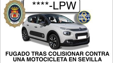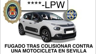 La Policía Local de Sevilla pide colaboración ciudadana para localizar al conductor de vehículo Citroën Cs de color claro o dorado acusado de darse a la fuga tras colisionar contra una motocicleta en la zona sur de la ciudad dejando herido grave a un hombre de 76 años.