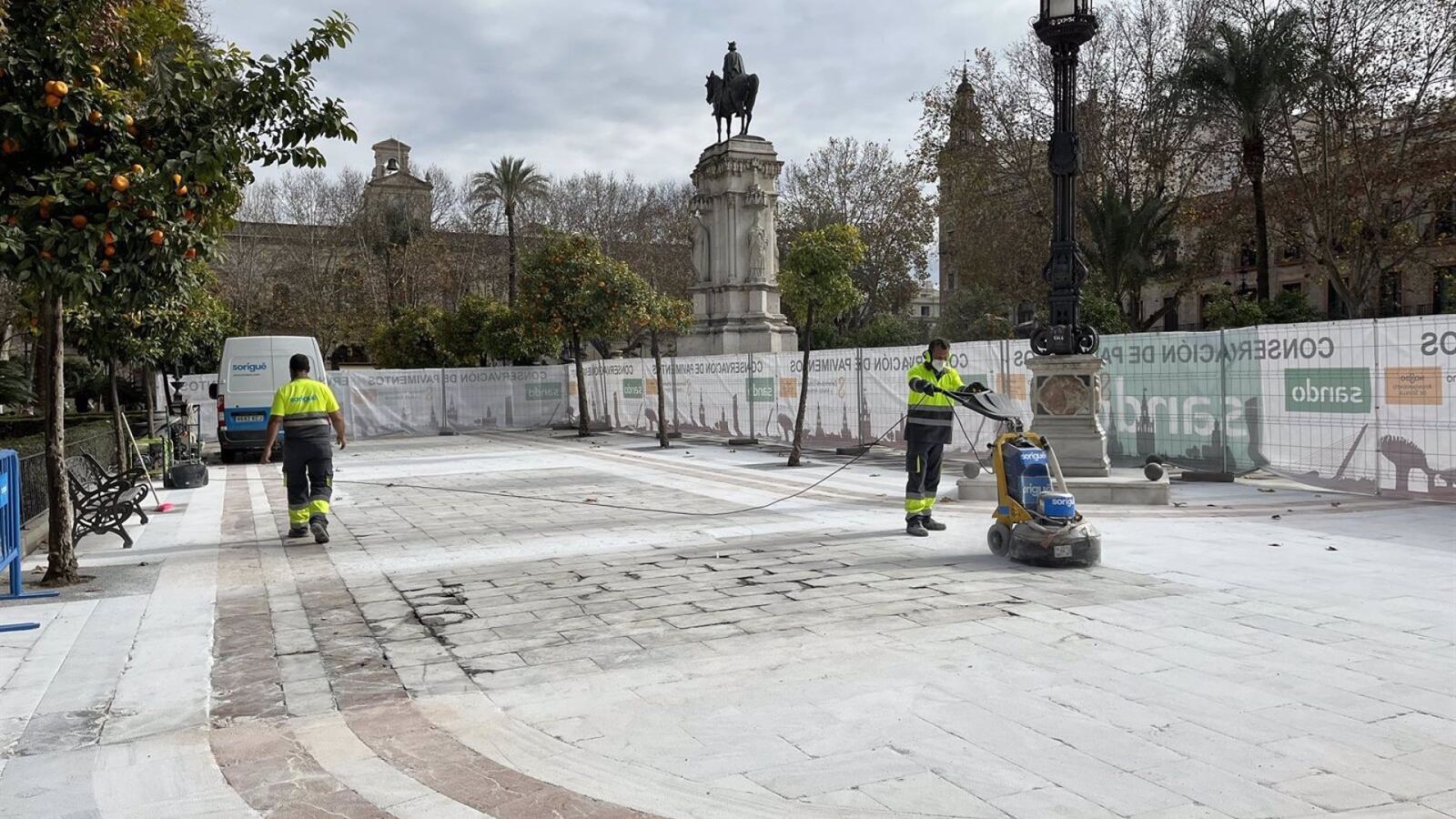El Ayuntamiento de Sevilla, a través de la Gerencia de Urbanismo y Medio Ambiente y en coordinación con el Distrito Casco Antiguo, está aplicando estos días al pavimento de mármol de la Plaza Nueva un tratamiento especial superficial (microabujardado) para evitar resbalones cuando llueve.
