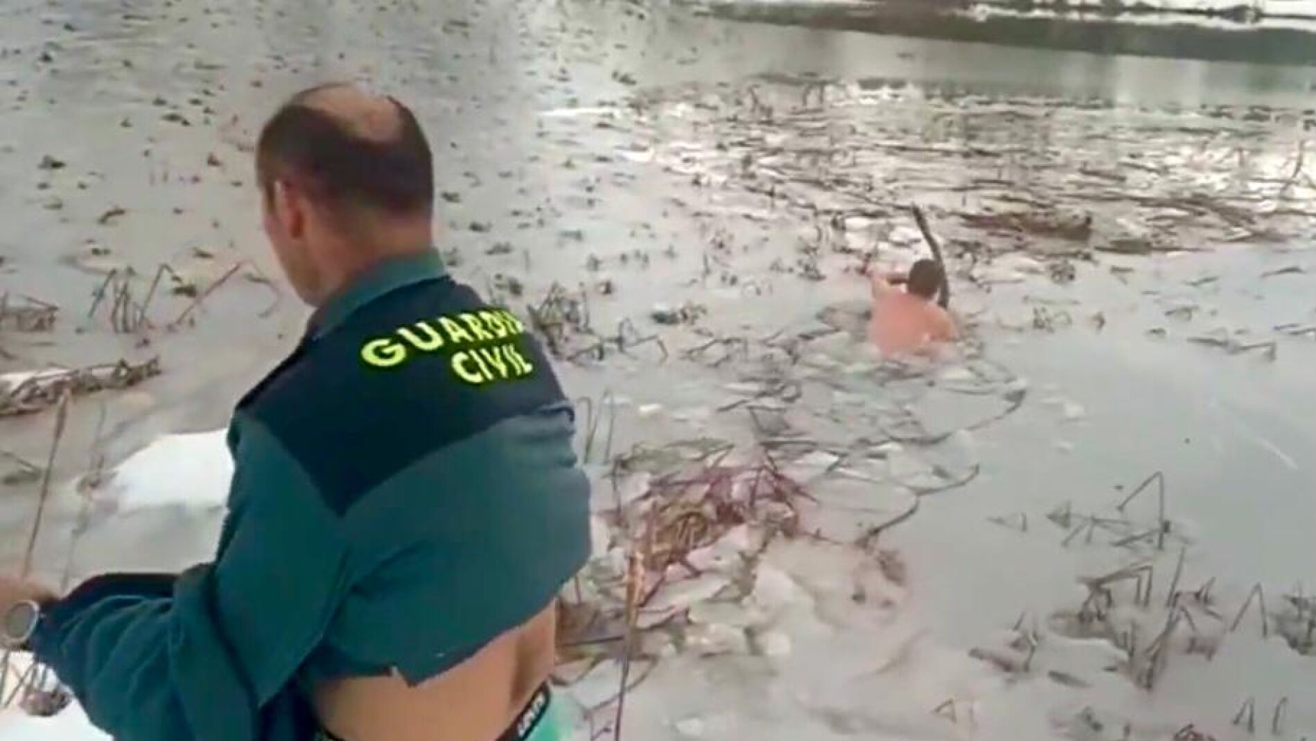Dos agentes de la Guardia Civil del puesto de Canfranc, en Huesca, se han lanzado a agua helada de una balsa de Badaguás (Jaca) para rescatar a un perro que se había quedado atrapado en el agua.