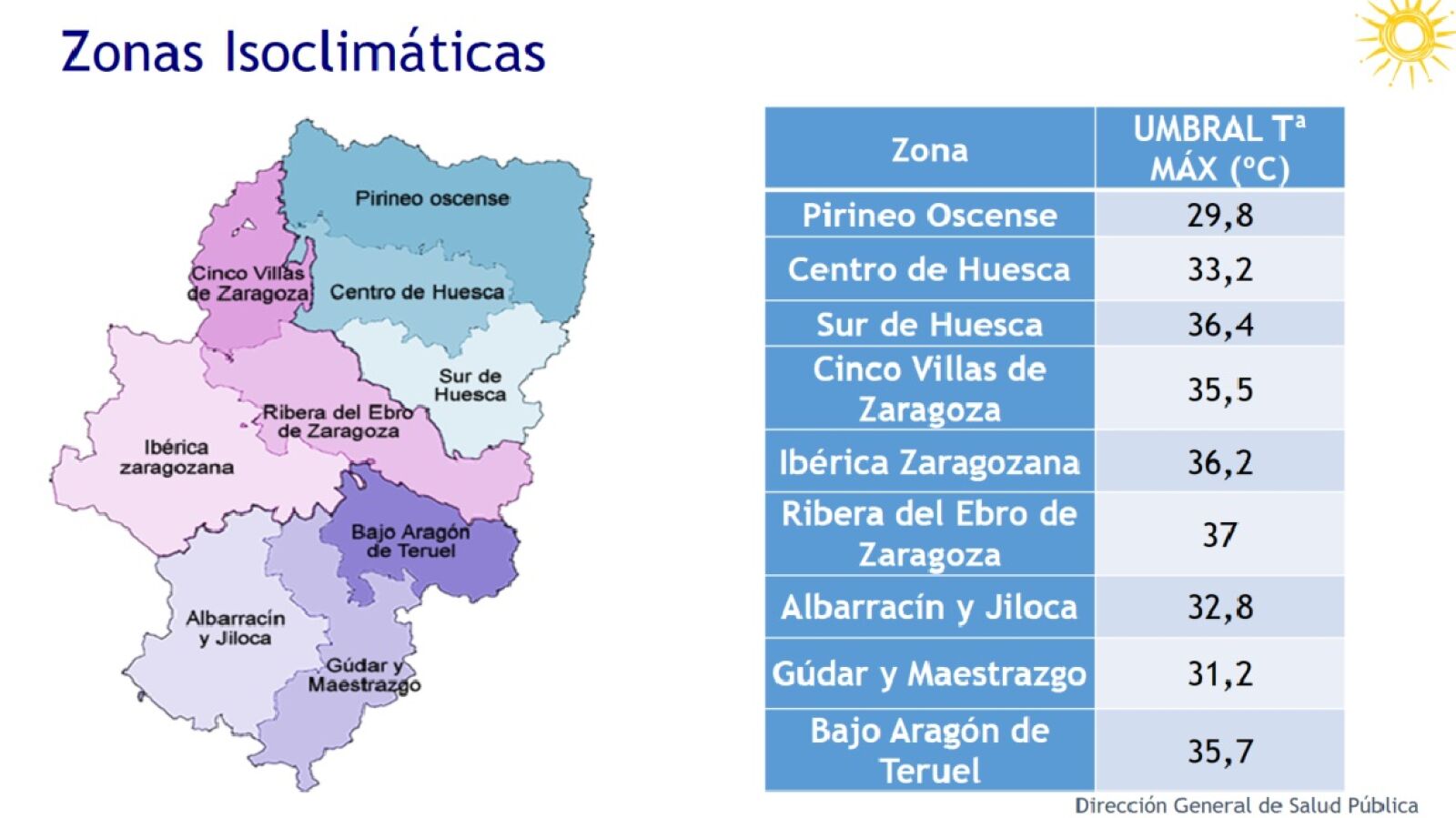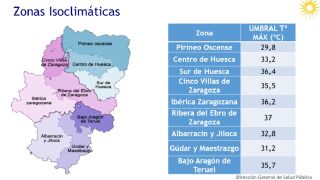 Se emitirán alertas a la población cuando exista una previsión de superar el umbral de riesgo, que es distinto en cada zona. Por ejemplo, en la ribera del Ebro de Zaragoza ese umbral se sitúa en los 37 grados, mientras que en el Pirineo oscense es de 29,8. A partir de esas temperaturas, se considera que puede aumentar la mortalidad. La directora general de Salud Pública, Nuria Gayán, ha explicado la principal novedad de este año. En lugar de dividir el territorio en las tres provincias, se han definido nueve regiones isoclimáticas, lo que permitirá que las alertas sean mucho más precisas.