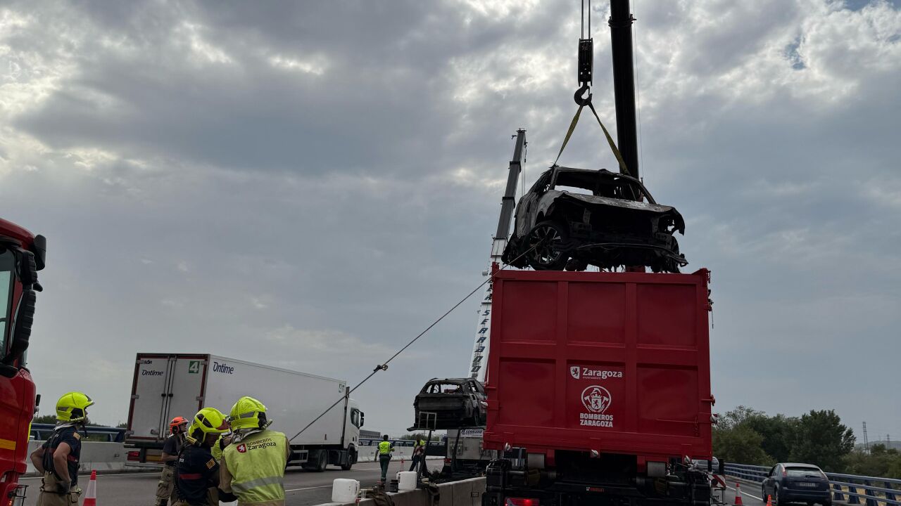 Un tráiler que trasportaba vehículos comenzó a arder en el kilómetro 326 de la A-2, a su paso por el distrito de Santa Isabel. El origen fue en el motor de un coche híbrido, la nueva herramienta de extinción que "básicamente es una piscina, un contenedor estanco en el que se sumerge el vehículo incendiado y se controla una posible reavivación del fuego y enfriar el vehículo" como ha explicado Pedro Lorén, jefe de intervención responsable de vehículos de Bomberos de Zaragoza.