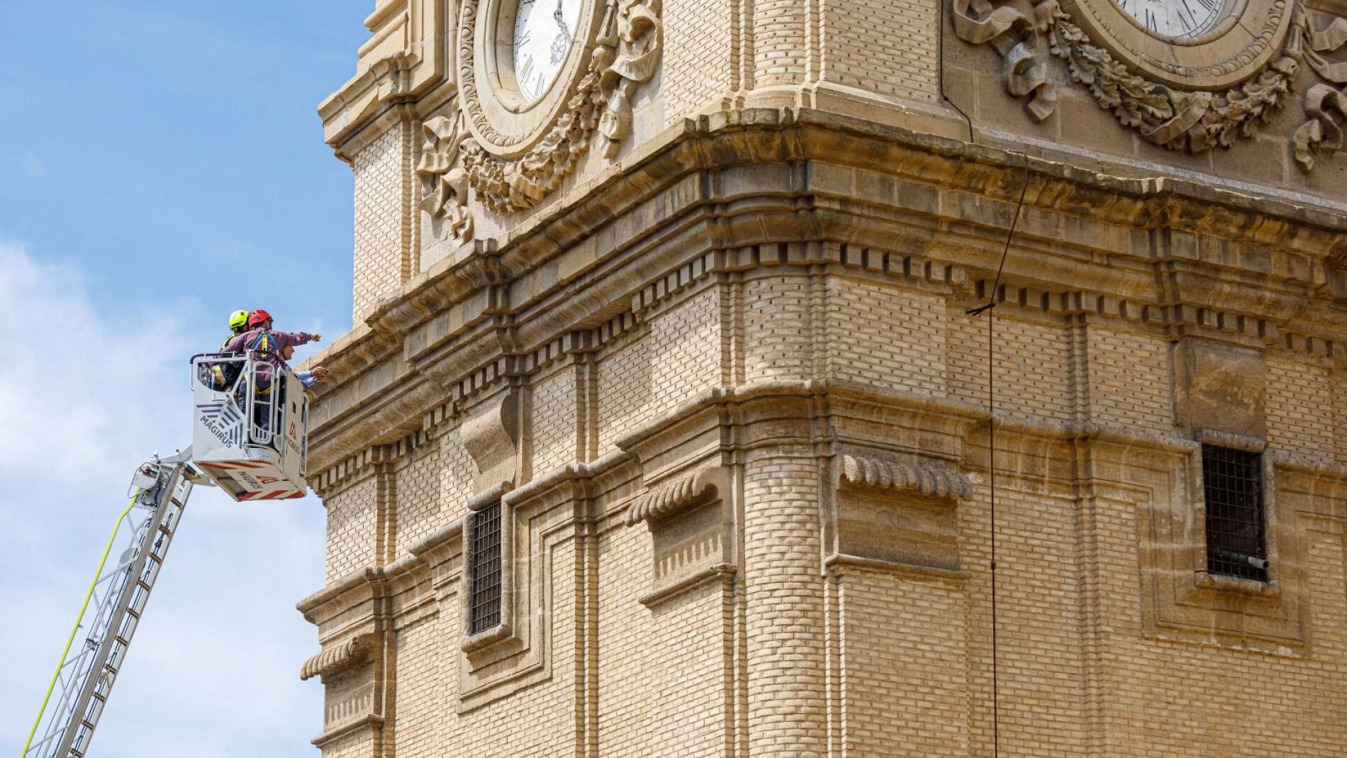 Los bomberos de Zaragoza inspeccionan con drones y grúas las cuatro torres de la basílica del Pilar para analizar el estado de las cornisas y otros elementos ornamentales, y actualizar con esa información el proyecto de restauración encargado a raíz de los desprendimientos ocurridos en mayo de 2022. El cuerpo dependiente del consistorio colabora así con el Cabildo, que ejecutará esos trabajos presupuestados inicialmente en unos dos millones de euros.