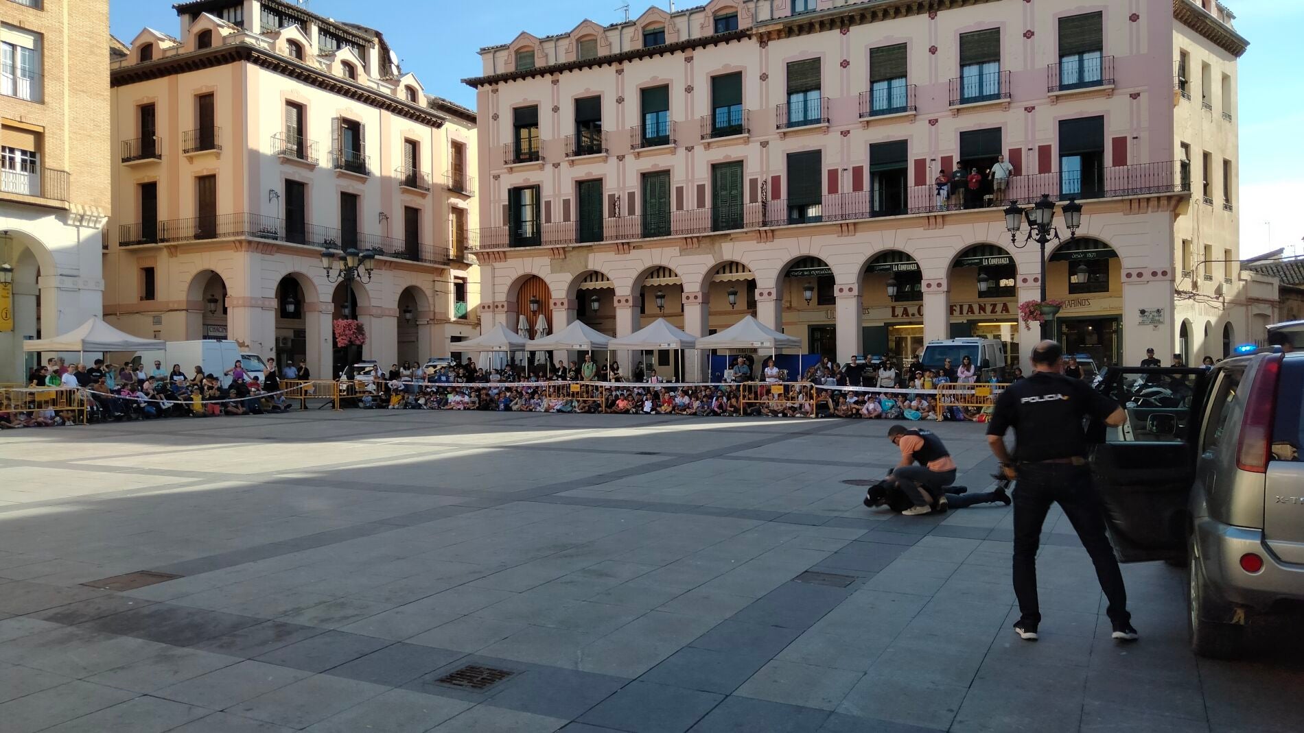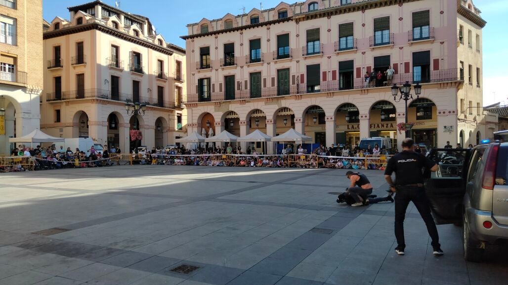 La Policía Nacional ha abierto sus actos por los Santos Ángeles Custodios, patrón del cuerpo y que se celebra el próximo martes 3 de octubre, con una serie de exhibiciones en la plaza Luis López Allué de Huesca ante más de 570 niños, entre escolares y usuarios de Aspace y Valentia.