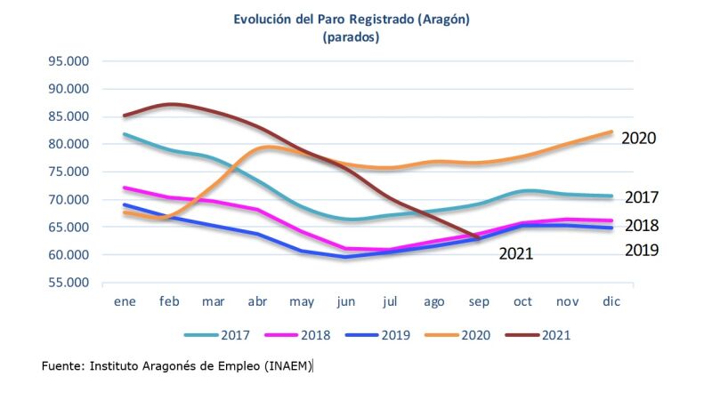 Actualmente, hay 63.129 aragoneses inscritos en las oficinas del INAEM, cifra que nos sitúa en valores similares a los de antes de la pandemia. El dato interanual es muy importante porque el paro en Aragón se ha reducido en 13.561 personas en doce meses, un 17,68%. A pesar del final de la temporada de verano, el paro se redujo en más de 2.100 personas en el sector servicios. Además, la consejera de Economía, Marta Gastón, destaca que la afiliación roza ya las 579.000 personas.