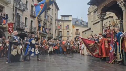 Gran animación en Jaca a pesar de la lluvia en el Primer Viernes de Mayo. El tiempo ha respetado las primera horas de esta multitudinaria fiesta, declarada de Interés Turístico Nacional, pero a partir de mediodía las nubes y la lluvia han hecho su aparición. Pese a todo se ha cumplido con la programación prevista para la mañana, incluida la entrada triunfal del Conde Aznar y sus huestes victoriosas, acto central esta fiesta, que ha tenido como colofón el tradicional canto del himno en la calle Mayor.