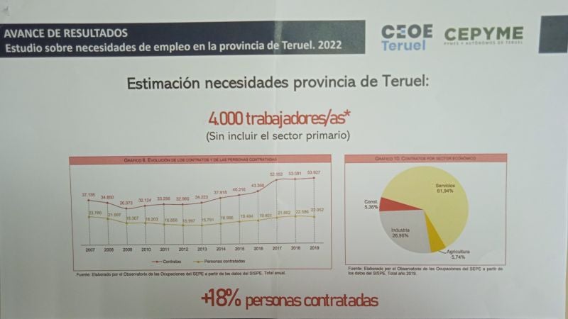 Los empresarios turolenses tienen previsto incrementar un 18% las contrataciones con respecto al año pasado. Según ha explicado el vicepresidente de CEPYME Teruel, José Antonio Guillén, "lo más significativo es que más de la mitad de las empresas consultadas prevé contratar cuatro trabajadores o más, lo que demuestra que no se trata de algo coyuntural, sino que la falta de mano de obra es un problema estructural".