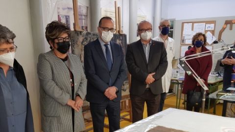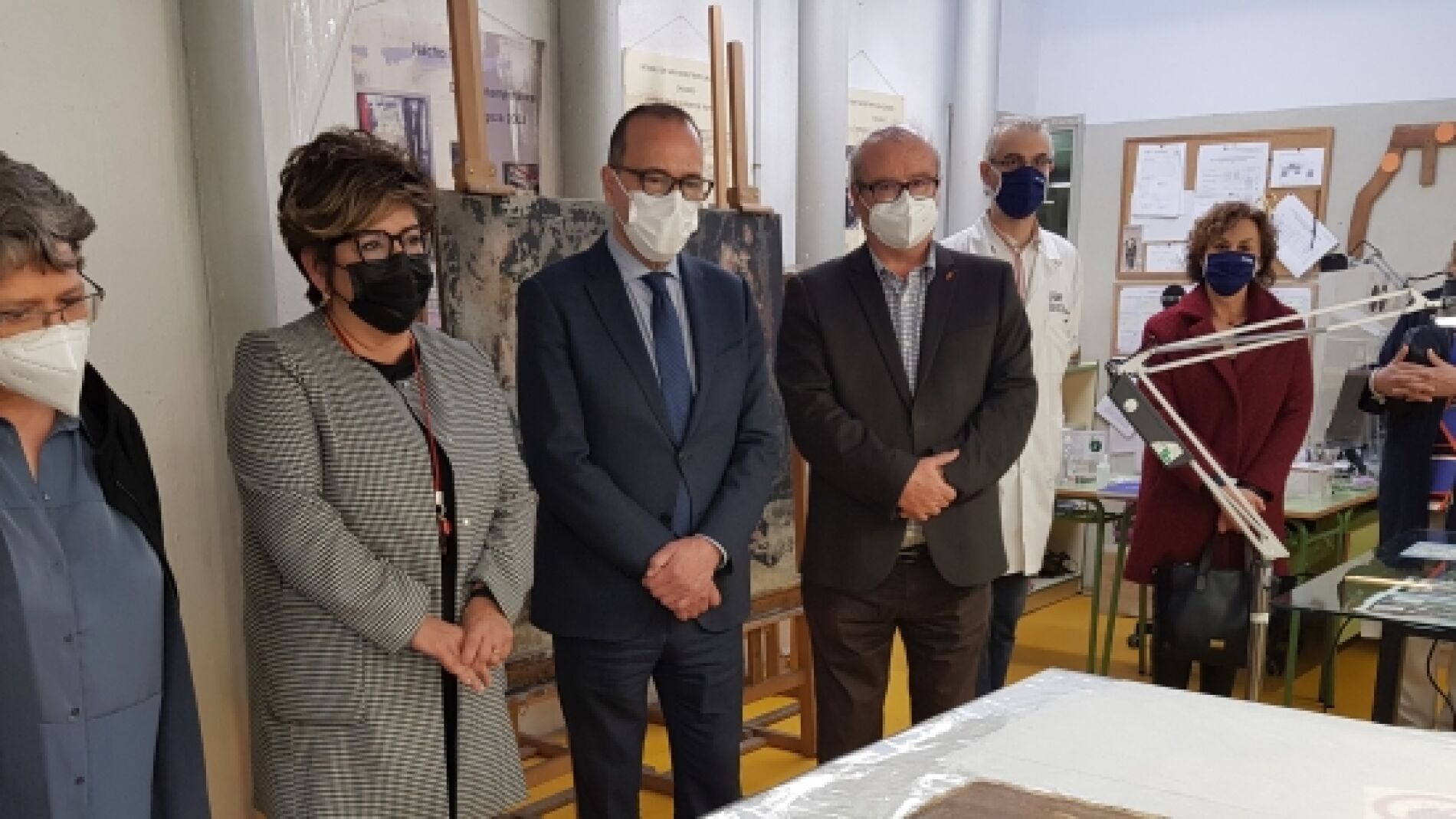 La Escuela Superior de Conservación y Restauración de Bienes Culturales de Aragón (ESCYRA) trabaja en un procedimiento de actuación para el futuro traslado de las pinturas murales de Sijena desde el Museo Nacional de Arte de Cataluña (MNAC) y su colocación en la sala capitular del monasterio. A partir del estudio exhaustivo de las pinturas el proyecto contempla una propuesta de desmontaje, transporte, restauración y recolocación de las pinturas en su espacio original que suponga el mínimo riesgo para las mismas. El consejero de Cultura, Felipe Faci, ha visitado hoy la escuela para conocer de cerca el trabajo que se está realizando.