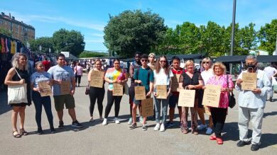 En la actualidad, el mercado de venta ambulante de la capital oscense cuenta con 63 puestos. A través de esta campaña el Ayuntamiento ha hecho entrega a sus propietarios de 6.500 bolsas en dos tamaños, pequeña y grande, serigrafiadas con el skyline de la ciudad y con el slogan “Más de 100 años parando en Huesca” para que las repartan entre sus clientes. Un acción con la que el Ayuntamiento quiere agradecer el esfuerzo realizado durante los dos últimos años de pandemia por los vendedores ambulantes.