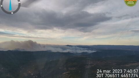 El incendio que afecta a la provincia de Teruel evoluciona favorablemente, ya que el viento ha girado y las llamas retroceden ahora hacia la provincia de Castellón. En estos momentos más de 150 efectivos de la lucha contra incendios trabajan en la zona y se han incorporado medios aéreos para contener las llamas. El fuego ha arrasado 3.000 hectáreas en las dos provincias, 800 de ellas en la de Teruel.