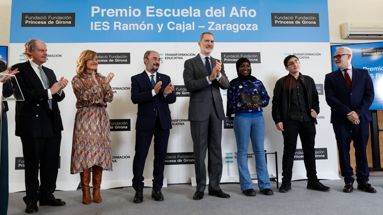 Felipe VI ha presidido el acto de entrega del Premio Escuela del Año 2021 al IES Ramón y Cajal de Zaragoza. El Rey ha entregado al director y dos alumnos este reconocimiento con el que la Fundación Princesa de Girona premia el modelo educativo basado en la igualdad, la inclusión e innovación que impulsa ese centro en el que estudian casi 450 alumnos de más de 36 nacionalidades.