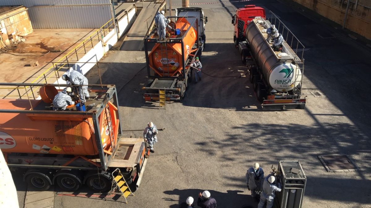 El ejercicio consistió en la simulación de un accidente de un camión-cisterna cargado de cloro, que requirió el trasvase de este producto a una nueva cisterna.