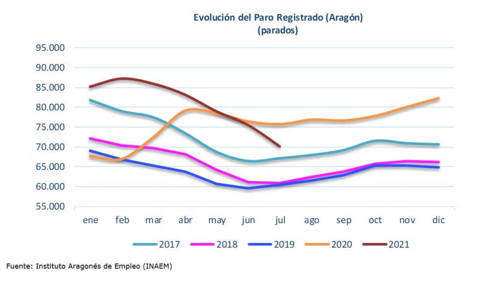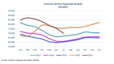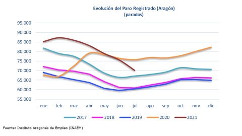 En el séptimo mes del año, el desempleo se ha reducido respecto al mes precedente en las tres provincias aragonesas: en 3.583 personas en Zaragoza (un 6,07 %), en 1.081 en la de Huesca (un 10,50 %) y en 650 en Teruel (un 10,39 %).De este modo, el número total de parados registrados asciende a 55.447 en Zaragoza, a 9.213 en Huesca y a 5.604 en Teruel.
