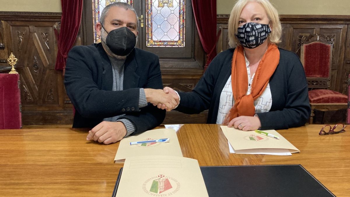 La directora de proyectos de la Fundación Térvalis, Elena Utrilla, y el director del Museo de Arte Sacro de Teruel, Pedro Luis Hernando, han firmado esta mañana un convenio de colaboración para el desarrollo del programa de actividades museísticas durante este año 2022 y la puesta en marcha del Proyecto Spiritum.
