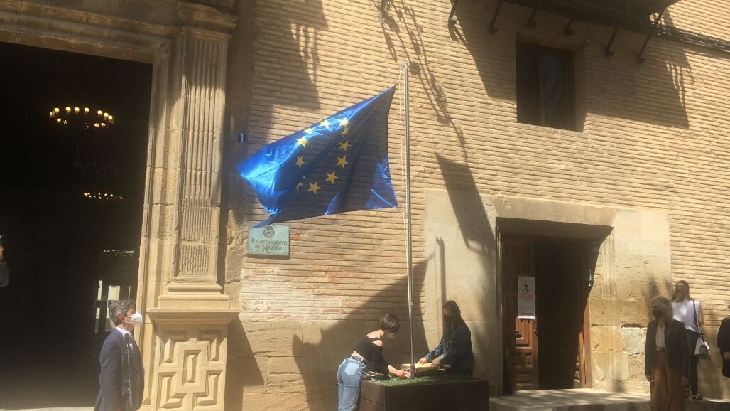 El Ayuntamiento de Huesca ha organizado esta mañana en la plaza de la Catedral un acto institucional para conmemorar el Día de Europa, que se celebra el 9 de mayo.