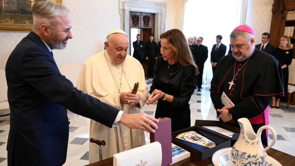 La alcaldesa de Zaragoza, Natalia Chueca, se ha sumado a dicha invitación y ha aprovechado también para pedirle un mensaje de cara a las próximas Fiestas del Pilar. Además, Chueca, ha hecho entrega de varios presentes al pontífice. Por ejemplo, le ha regalado jamón para promocionar los productos de tierra, entre otros.