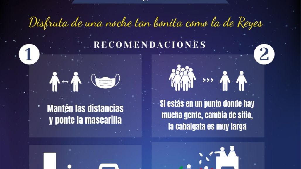 En cuanto al público, se han establecido las siguientes normas de seguridad: mantener la distancia y llevar mascarilla, cambiar de sitio si en el lugar elegido para verla ya hay mucha gente, no bajarse de la acera cuando pase la Cabalgata y no acercarse a los vehículos cuando tiren caramelos.