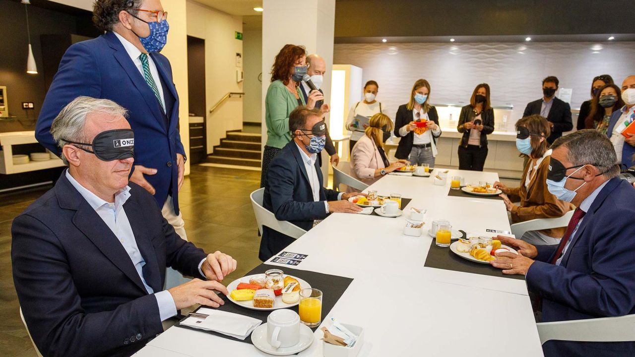 El alcalde de Zaragoza, Jorge Azcón, fue uno de los primeros en comprobar cómo es sentarse a la mesa para desayunar siendo invidente, participando junto a otros invitados en un desayuno a ciegas. Con esta actividad, ONCE Aragón comenzaba el lunes su semana de actividades.