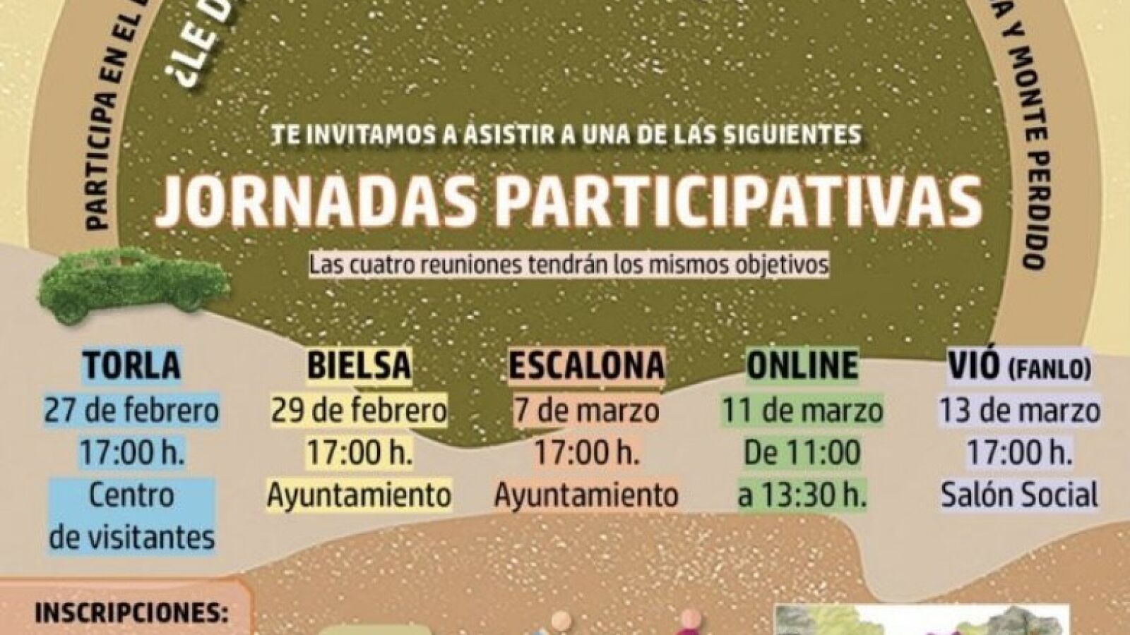 El Laboratorio de Aragón de Gobierno Abierto es quien coordina esta fase del proceso que incluirá cuatro reuniones en los diferentes sectores del Parque Nacional, además de una sesión online. La primera de ellas será en el centro de visitantes de Torla – Ordesa el 27 de febrero; el Ayuntamiento de Bielsa acogerá la segunda el día 29, el Ayuntamiento de Escalona la tercera el 7 de marzo y en el centro social de Vió en Fanlo se celebrará la cuarta el 13 de marzo. Por su parte, la reunión online tendrá lugar el 11 de marzo.