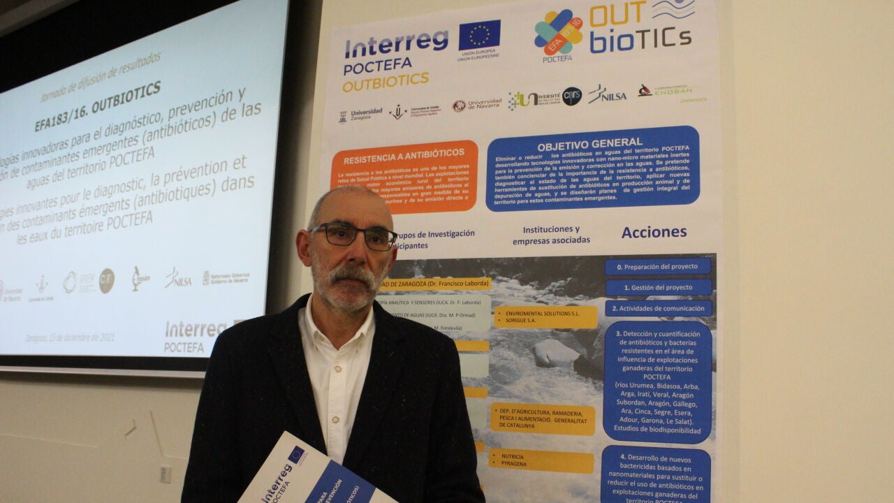 El coordinador del proyecto Outbiotics y catedrático de Química Analítica en la Universidad de Zaragoza, Francisco Laborda, explica que el objetivo de detectar y cuantificar la presencia de antibióticos y resistencias antimicrobianas, así como las posibilidades para la prevención de su uso y su eliminación.