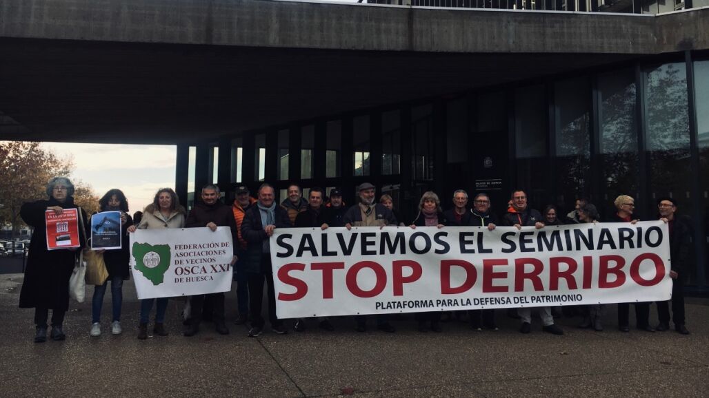 Esta mañana una veintena de personas se han concentrado a las puertas del Palacio de Justicia para apoyar las reivindicaciones de Apudepa y de la Plataforma para la Defensa del Patrimonio para evitar el derribo del edificio del Seminario. Posteriormente se ha celebrado una vista en el Juzgado de Huesca, en la que los peritos de ambas entidades patrimonialistas han ratificado sus respectivos informes técnicos, ya aportados en la demanda contra el Ayuntamiento de Huesca para lograr el mantenimiento integral del edificio.