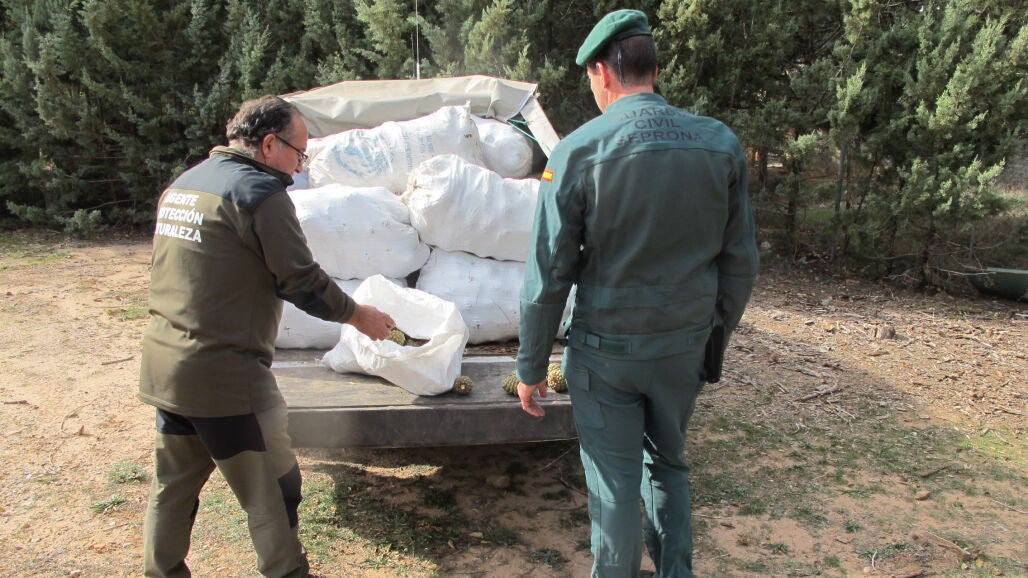 El Seprona de Teruel y Agentes de Protección de la Naturaleza del Gobierno de Aragón han denunciado a un grupo de personas por recolectar piñas. Fueron pillados con más de 500 kilos y aunque tenían fin comercial, carecían de autorización.