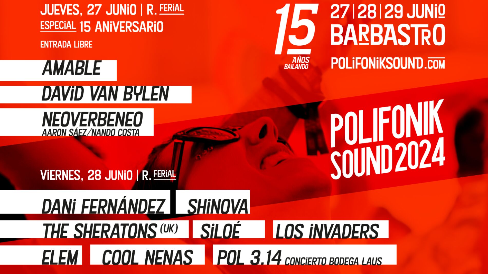 A una semana de abrir las puertas del PolifoniK Sound, el festival presenta en Huesca su edición más exitosa, la de su 15 aniversario, con jornada de celebración incluida prevista para el próximo jueves, 27 de junio, seguida de las dos jornadas propiamente del festival, el 28 y 29 de junio, que cuentan ya con aforo prácticamente completo. A la venta quedan las últimas entradas de un festival que hará su mayor despliegue hasta la fecha, con 36 bandas en un cartel que encabezan Dani Fernández, Shinova, Taburete, Carlos Sadness y Sexy Zebras.