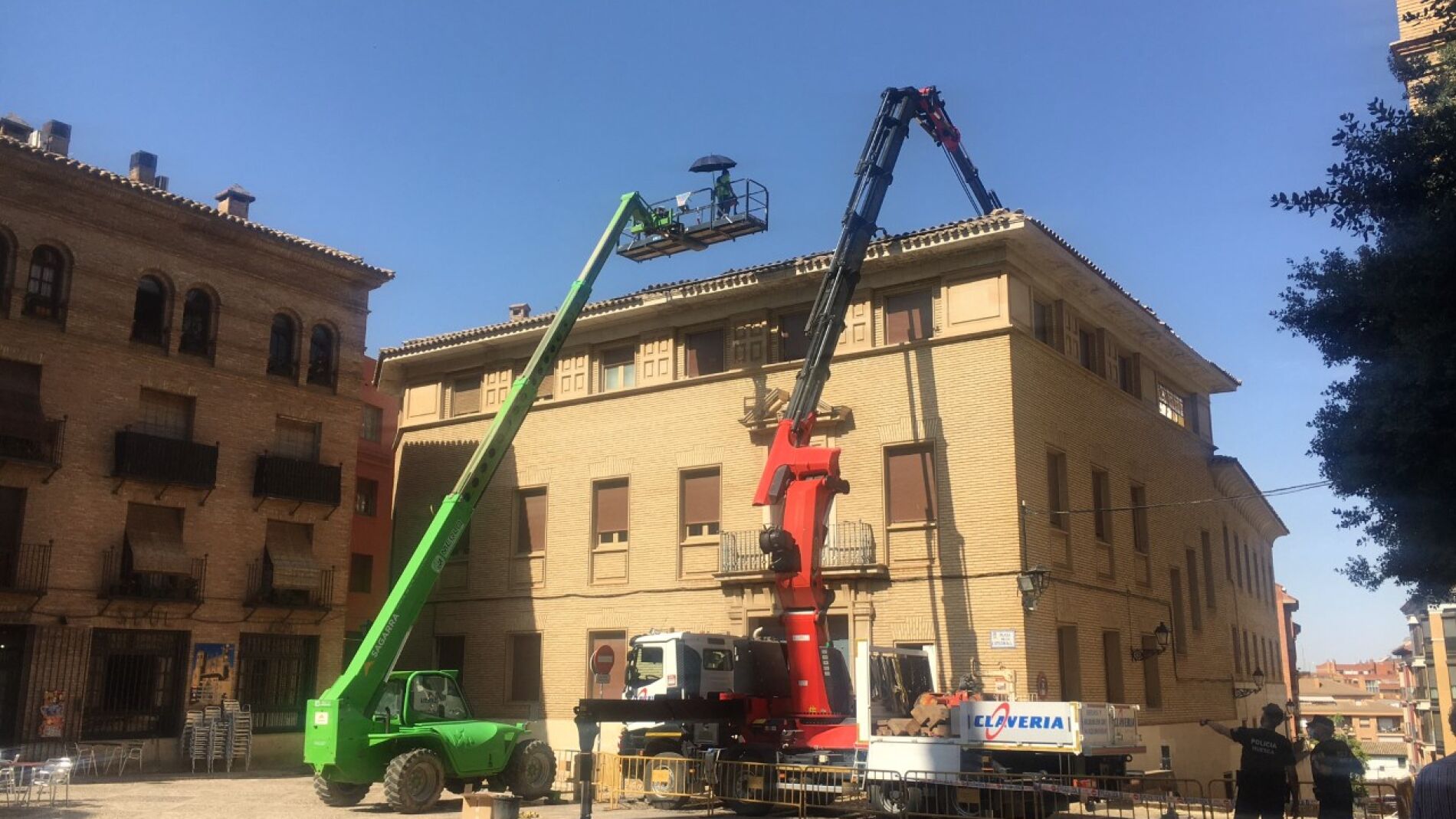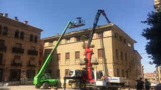 Desde primera hora de la mañana se están realizando las tareas de desescombro. Los operarios han estado trabajando con la ayuda de una gran grúa para retirar los escombros más voluminosos de los más de 200 metros cuadrados de superficiedel tejado del Obispado de Huesca que se desplomaron el pasado viernes sobre la última planta. Una delicada tarea que ha obligado a acordonar la zona y a mantener el edificio cerrado por motivos de seguridad. El arquitecto de la Diócesis de Huesca, Joaquín Naval, espera que estos trabajos puedan llevarse a cabo lo antes posible. Además, en vista de que a partir del jueves se anuncian más lluvias, la idea es poder impermeabilizar en lo posible la cubierta para evitar la entrada de más agua o al menos poder reconducirla.