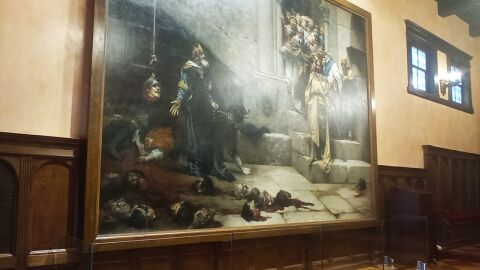 El Ayuntamiento de Huesca ha colocado una barrera laminar de vidrio delante del cuadro de La Campana de Huesca para garantizar su custodia durante las recepciones y visitas que acoge el Salón del Justicia, donde está instalado. Para ello se han invertido cerca de 2.300 euros, cabe recordar que el cuadro se encuentra en depósito temporal del Museo Nacional del Prado.