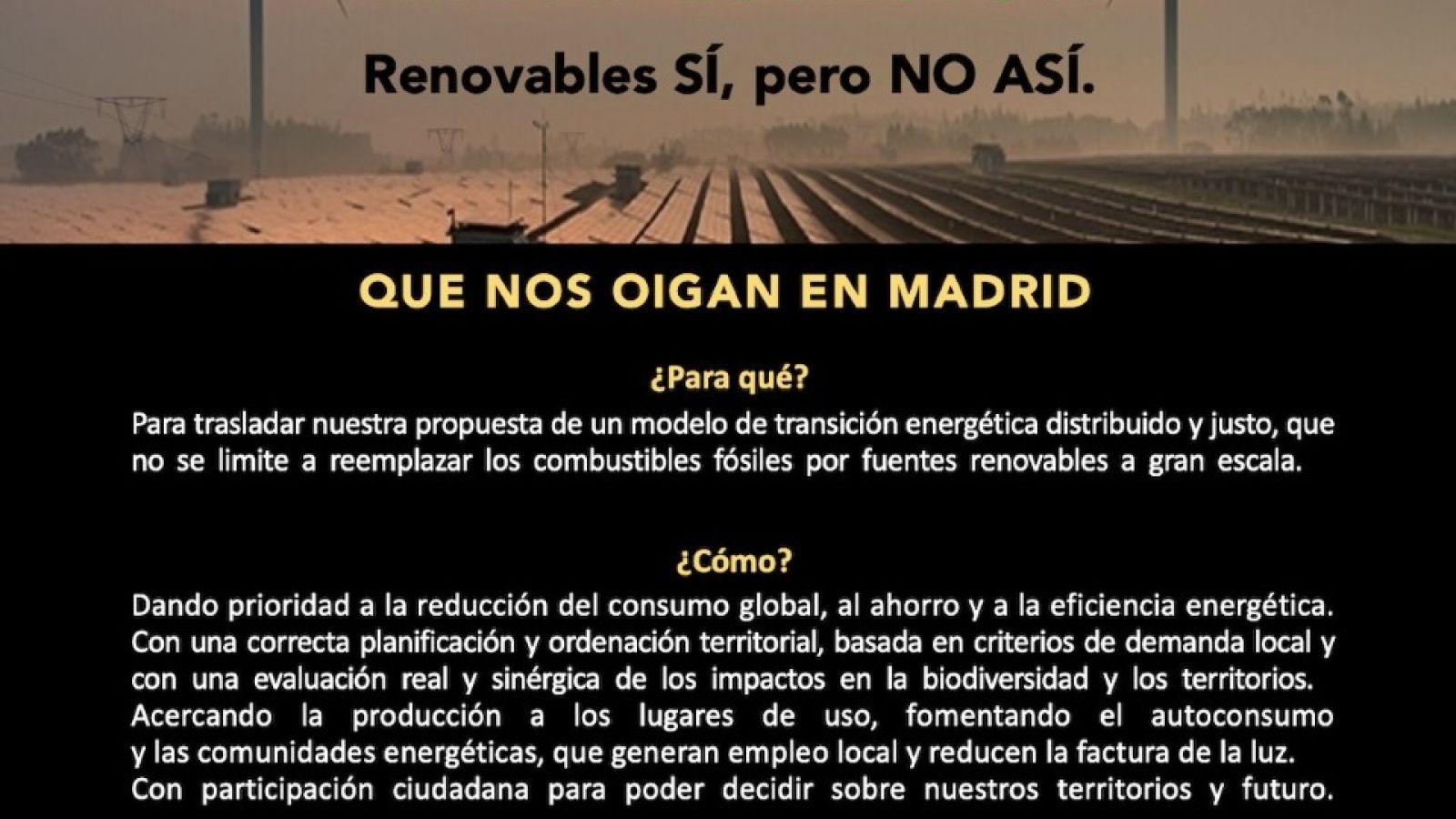 Los convocantes quieren denunciar que la llegada masiva de parques eólicos y fotovoltaicos supondrá la ocupación de miles de hectáreas en un tiempo récord, unida a la expropiación de terrenos a favor de empresas privadas. Un modelo que está sufriendo la España Vaciada, donde los ayuntamientos no disponen de suficientes recursos administrativos para hacer frente a las alegaciones.