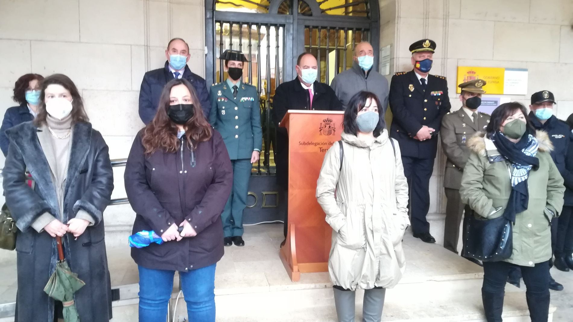 Los actos han arrancado a las nueve de la mañana en los porches de la plaza San Juan con un minuto de silencio, donde se ha presentado a la Teniente Coronel jefa de la Comandancia de la Guardia Civil en Teruel, Silvia Gil, como premio Menina por el despliegue que este cuerpo de seguridad lleva a cabo en todo el territorio en la lucha contra esta lacra.