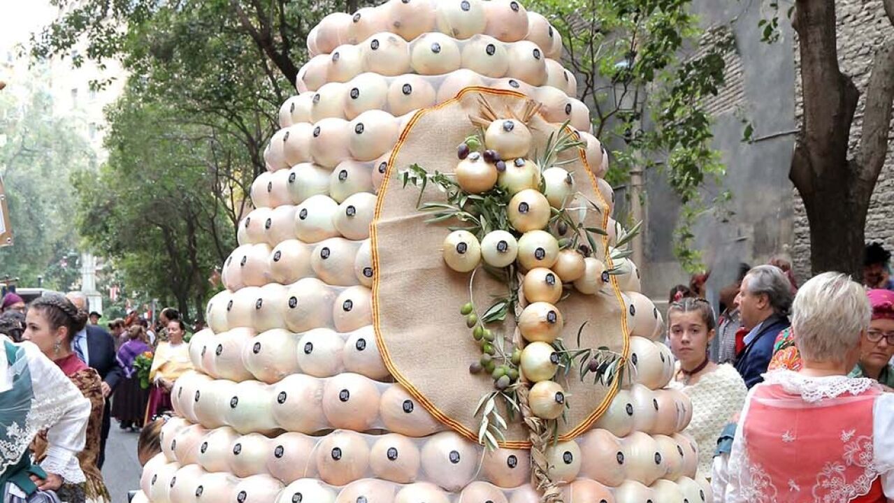 Grandes cestas con melocotón de Calanda, uva del Somontano, cebolla de Fuentes de Ebro, longaniza de Graus, panes y tortas de Pozuelo de Aragón, aceite del Bajo Aragón y productos de la huerta aragonesa, desde pimientos hasta lechugas y berenjenas se han ofrecido a la Virgen del Pilar en la tradicional Ofrenda de Frutos que se realiza todos los 13 de octubre.