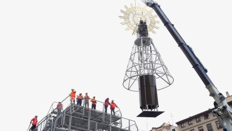 En la plaza del Pilar de Zaragoza ya ha terminado el montaje de la estructura piramidal de la Ofrenda de Flores a la Virgen, que alcanza los 15,5 metros de altura y un peso de 40 toneladas. Se calcula que este miércoles se depositarán en ella siete millones de flores. Muchos curiosos han sido testigos de la colocación de la virgen en la cima de la estructura, con fuertes medidas de seguridad, a cargo de dieciocho operarios. La vicealcaldesa, Sara Fernández, celebra que ya está todo preparado para una ofrenda que se prevé multitudinaria.