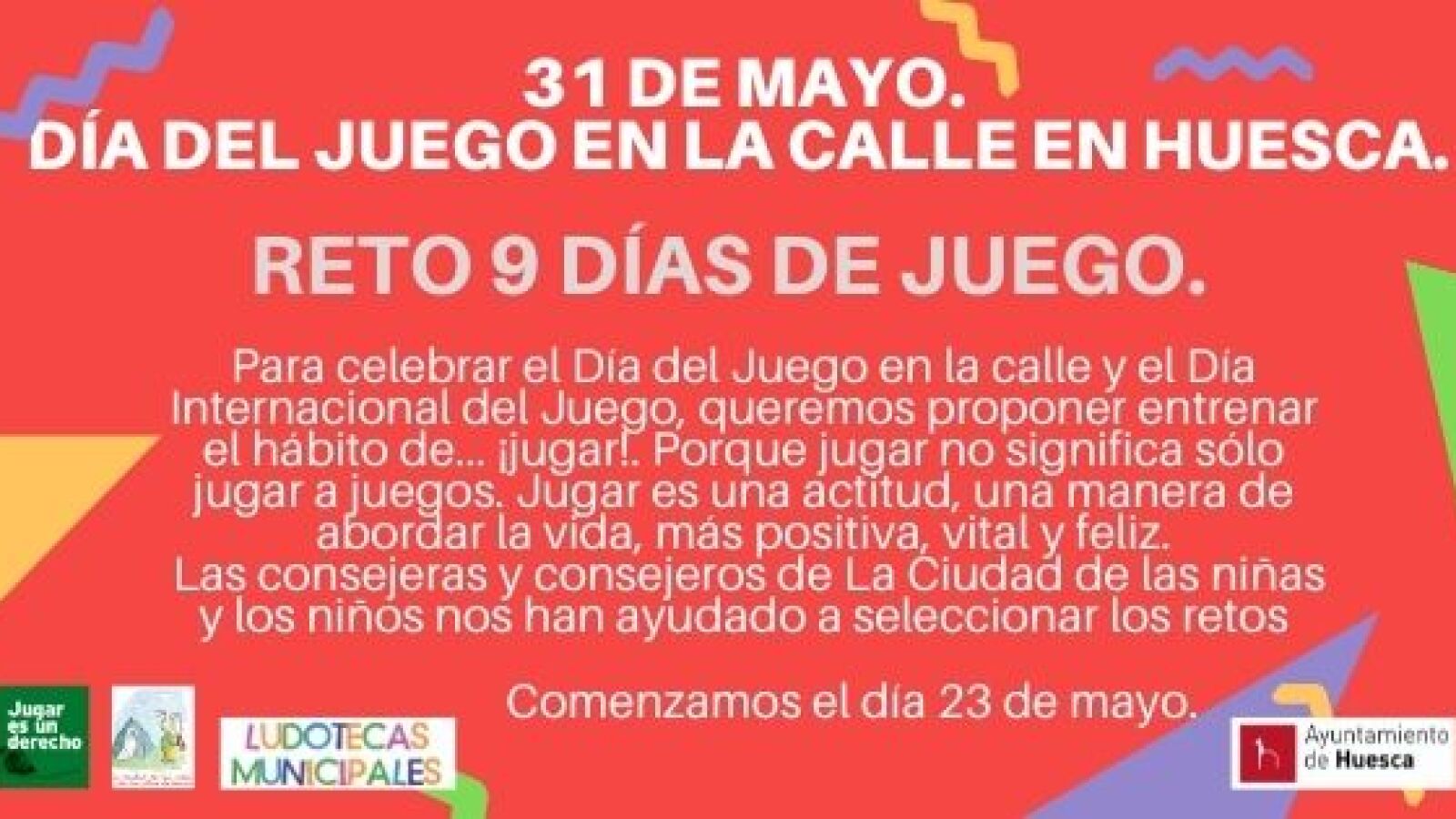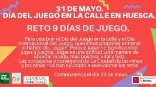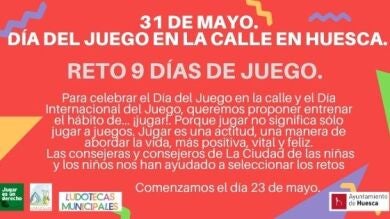 Las Ludotecas y la Ciudad de las Niñas y los Niños de Huesca organizan un año más retos y actividades con motivo de la celebración, el próximo 31 de mayo, del Día Internacional del Juego en la Calle. En esta ocasión lanzan de nuevo el reto “9 días de juego” que comenzará el próximo lunes día 23. Busca que los más pequeños participen en diferentes pruebas y los adultos se involucren en el juego para motivar la reflexión sobre la importancia del juego en la vida infantil y adulta.