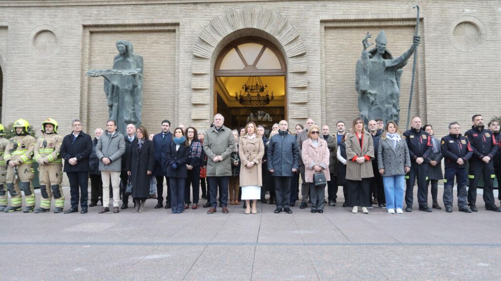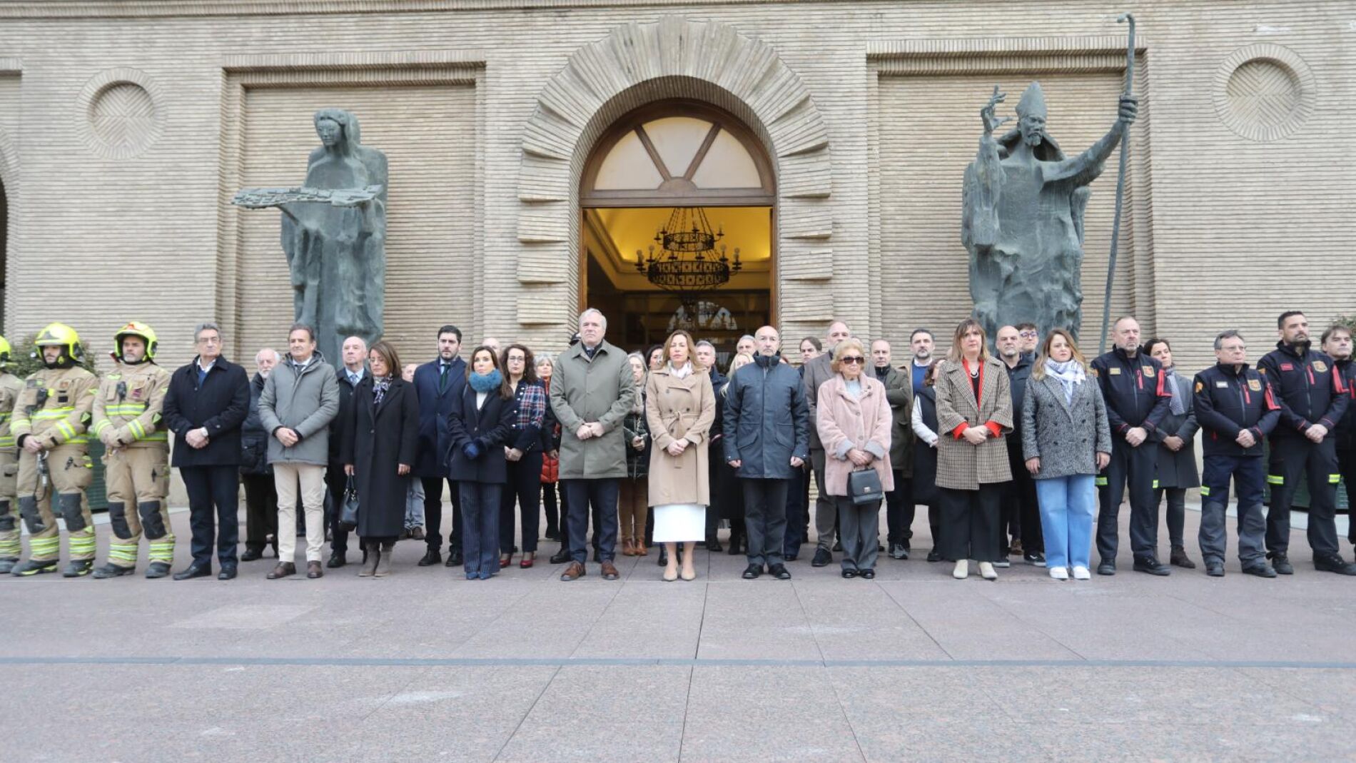 El delegado del Gobierno, Fernando Beltrán; el presidente del Gobierno de Aragón, Jorge Azcón; el vicepresidente, Alejandro Nolasco, y otros consejeros, diputados y miembros de bomberos y fuerzas y cuerpos de seguridad del estado han participado en ese minuto de silencio en la Plaza del Pilar. La presidenta de la Casa de la Comunidad Valenciana en Zaragoza, Clara Perales, ha gradecido el apoyo social y de las administraciones en estos momentos tan duros para las familias de las víctimas y para los vecinos que han perdido su hogar y sus pertenencias.