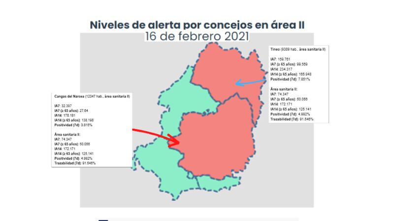 El Mapa Semafórico ha cambiado de color para ambos concejos del Área Sanitaria II, pasando de los colores azul oscuro y rojo oscuro (niveles 4+ y 4 respectivamente), a color rojo, que significa Nivel 3 Riesgo Alto.