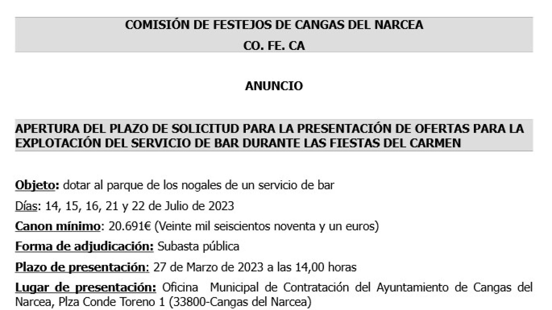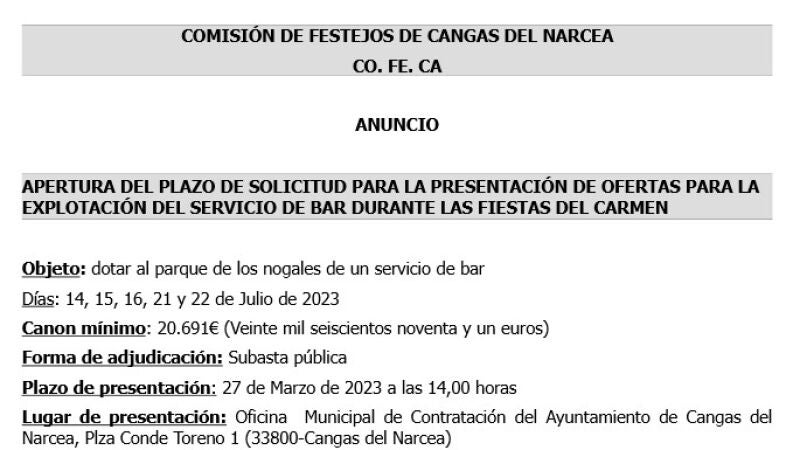 Sale a subasta la explotación del servicio de bar durante las fiestas