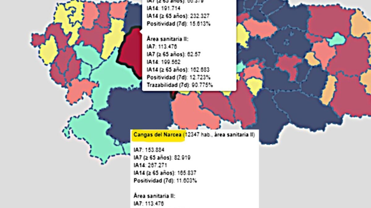 En Cangas del Narcea hay 33 casos activos, por lo que la IA14d se sitúa en 262 casos por cada 100.000 habitantes. El análisis del Observatorio de la Salud es, "sigue la inestabilidad en Cangas del Narcea, donde se observa que la IA7 tiene una tendencia ligeramente ascendente los últimos días (amén de los que falten por geolocalizar) además de inestabilidad e incluso crecimiento en su positividad".