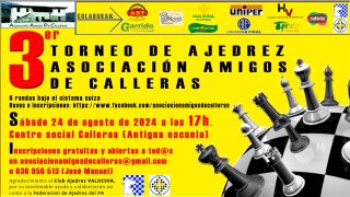 Ubicada en el Centro de Interpretación de Calleras (antigua escuela), la Asociación trabaja en el desarrollo de distintas actividades para adultos y niños a partir de 3 años, entre ellas ajedrez. Y, hablando de ajedrez, este sábado 24 de agosto se va a celebrar el III Torneo que, en este momento, cuenta con una inscripción de una cuarentena de participantes de todas las edades.