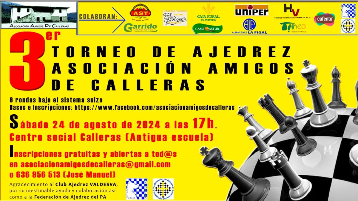 El torneo se realizará a partir de las 17h en la sede de la Asociación. José Manuel Cejas, presidente, destaca que "contaremos con ajedrecistas llegados desde distintos pueblos del occidente de Asturias como Cangas del Narcea, Tineo, Trevías, Navelgas, Grado y algunos más, además de con un MI (Maestro Internacional) del ajedrez que reside en Madrid, pero veranea en Asturias. Como años anteriores, contamos con la colaboración del Ayto. de Tineo y apoyo de distintas entidades y empresas como Transportes Garrido, embutidos Alta Sierra de Tineo, Campo Astur, Caja Rural, Tienda Víctor (una entrañable y adorable persona) y supermercados Uniper todos ellos de Navelgas, Hierros Valencia, Piensos la Figal, etc. y como no, contamos y agradecemos enormemente la inestimable ayuda y colaboración del Club Ajedrez Valdesva en la figura de su presidente, sin el cual este torneo habría sido algo más difícil desarrollarlo y poder seguir celebrándolo."