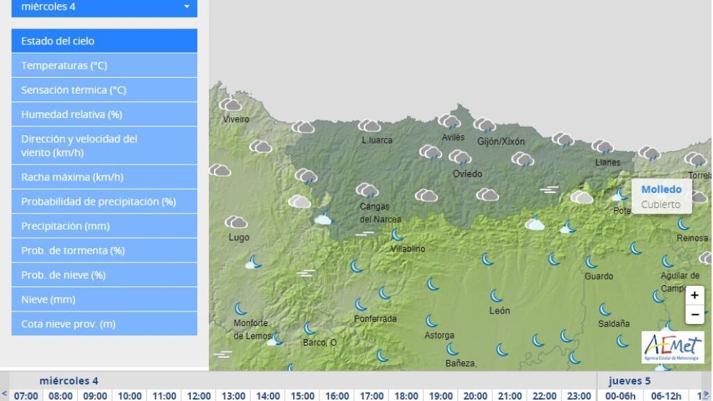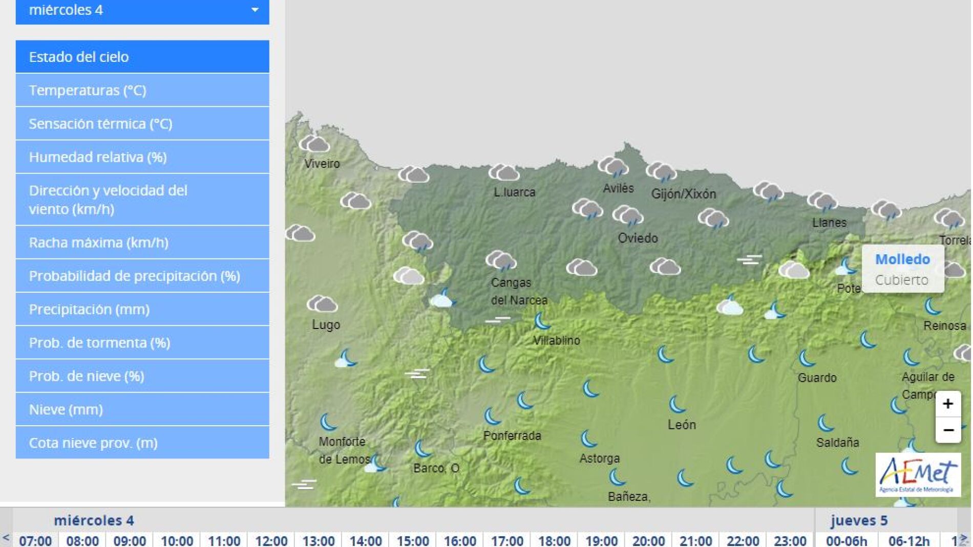 La Agencia Estatal de Meteorología prevé para hoy, miércoles, día 4 de mayo de 2022 en Asturias cielo nuboso o cubierto de nubes bajas con algunos claros en el sur al principio y en la costa al final. Lluvias débiles dispersas. Temperaturas mínimas sin cambios o en descenso en general ligero y máximas en ligero ascenso en el tercio sur y sin cambios en el resto. Viento flojo variable tendiendo a nordeste durante las horas centrales.