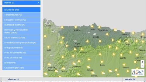La Agencia Estatal de Meteorología prevé para hoy, viernes, día 27 de mayo de 2022 en Asturias en la Cordillera poco nuboso aumentando al final del día los intervalos de nubes bajas, en el resto intervalos de nubes bajas con brumas y probabilidad de bancos de niebla en el interior al principio y al final del día y poco nuboso en las horas centrales.